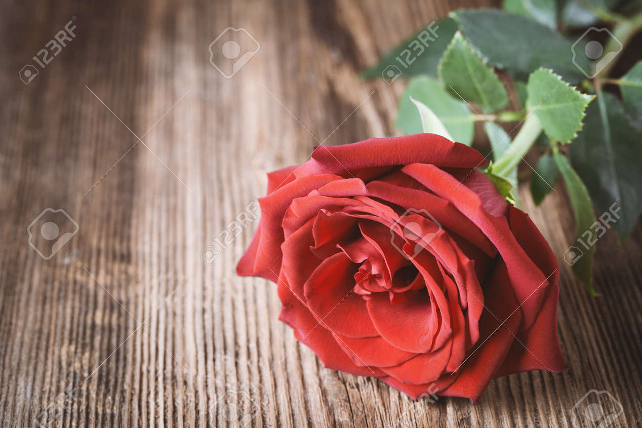 Single Red Rose On Wooden Background With Copyspace Love Romance